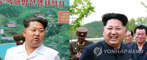 △ 갑자기 머리 하얗게 센 북한 김정은 (서울=연합뉴스) 김정은 북한 국방위원회 제1위원장의 얼굴 위로 빗어 넘긴 머리카락 앞부분이 하얗게 세어 있다. 특히 얼굴 오른쪽 위 머리카락에 흰 부분이 많았다. 이 사진(왼쪽)은 김정은 제1위원장이 한국전쟁 조국해방전쟁 사적지를 시찰, 사적지 전경도를 둘러보면서 수행원들과 얘기하는 장면이며 북한 노동당 기관지 노동신문 9일자 1면에 실렸다. 반면 김정은 제1위원장이 최근 조선인민군 제810군부대산하 신창양어장을 현지 지도(오른쪽)했을 당시 머리카락이 보일듯 말듯하게 희끗희끗하긴 했지만 이처럼 하얗게 세지는 않았다. 그때 사진은 노동신문이 지난달 15일 보도한 것이었다. 2015.6.9 nk photo yna co. kr