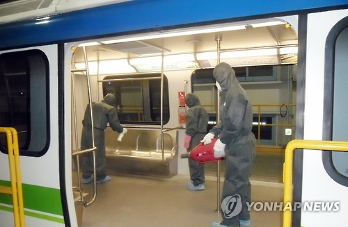 | △ "메르스 퇴치…경전철 내부도 소독" (용인=연합뉴스) 용인시 공무원들이 9일 중동호흡기증후군(메르스) 확산 방지를 위해 용인경전철 열차 내부에서 소독작업을 하고 있다. 2015.6.9 <<용인시 제공>> kcg33169@yna.co.kr |