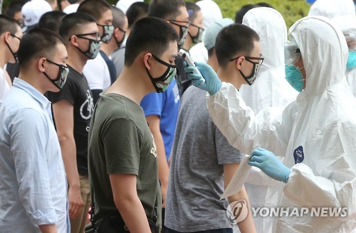 △ 육군훈련소 메르스 비상 (대전=연합뉴스) 양영석 기자 = 육군훈련소 관계자들이 8일 입영장병을 대상으로 체온검사를 하고 있다. 훈련소는 메르스 확산 방지차원에서 이날 예정된 입영행사를 취소하고, 입영장병 전원의 체온검사를 해 이상이 있는 입소자는 귀가조치했다. 2015.6.8 youngs@yna.co.kr