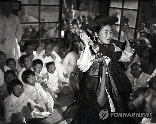 | △ 돼지족발 든 무녀 (부산=연합뉴스) 김선호 기자 = 1948년 한 무녀가 양손에 돼지족발을 하나씩 들고 굿을 펼치고 있다. 동네 꼬마 녀석들과 부녀자들이 빽빽하게 모여 앉아 굿 구경을 하고 있다. 이 사진은 당시 국내에 있던 한 미군이 촬영한 것으로 김한근 부경근대사료연구소 소장이 미국의 한 수집가로부터 입수했다. 2015.6.9 << 부경근대사료연구소 제공 >> wink@yna.co.kr |