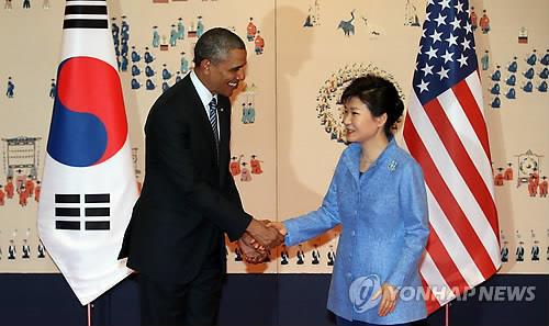 | △ 2014년 4월 25일 한·미 정상회담에 앞서 박근혜 대통령이 버락 오바마 미국 대통령과 악수하는 모습. 2015.6.10 << 연합뉴스 DB>> |