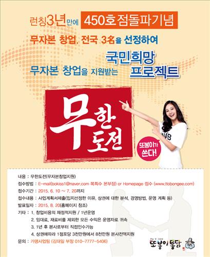 (서울=연합뉴스) 인교준 기자 = 옛날치킨 프랜차이즈인 또봉이통닭은 가맹점 450호점 돌파를 기념해 무자본 창업 기회를 제공하는 '무한도전' 국민희망 프로젝트를 진행한다고 10일 밝혔다.
