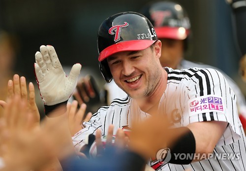 △ 한나한, '3점 홈런' (서울=연합뉴스) 윤동진 기자 = 10일 오후 서울 송파구 잠실야구장에서 열린 2015 프로야구 두산 대 LG의 경기. 1회 말 1사 1,2루 때 LG 한나한이 3점 홈런을 친 후 더그아웃으로 들어와 동료들과 하이파이브를 하고 있다. 2015.6.10 mon@yna.co.kr
