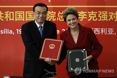 △ 5월 중순 브라질을 방문한 리커창 중국 총리(왼쪽)가 지우마 호세프 브라질 대통령과 만나 대규모 투자협정을 체결했다.(EPA=연합뉴스 자료사진)