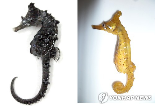 | △ 87년 만에 실체 밝혀진 한국 대표 해마 (부산=연합뉴스) 부경대 한상윤 연구원이 87년 만에 실체를 밝힌 우리나라 대표 해마(왼쪽)와 그동안 같은 종으로 인식됐던 일본 해마 '히포캄푸스 코로나투스'. 정수리에 난 뿔 모양의 돌기와 주둥이 비율이 확연하게 다르다. (부경대 제공) |
