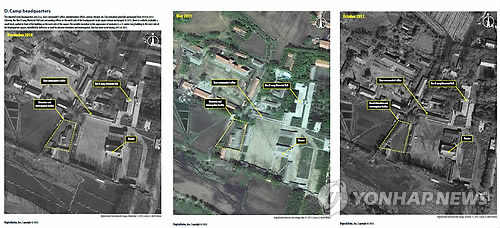 | △ 미국의 북한인권위원회(HRNK)가 지난 2012년 10월 24일(현지시간) 발간한 보고서에서 민간 위성업체인 `디지털글로브'가 함경북도 회령의 22호 관리소를 촬영한 위성사진 수십장을 제시한 사진으로, HRNK는 "수용소는 여전히 운영되고 있는 것으로 나타났다"고 밝혔다. HRNK는 지난 11일 촬영한 위성사진과 2010년 11월 및 2011년 5월의 위성사진을 비교, 분석한 결과 22호 관리소가 올해 폐쇄되거나 해체됐다는 보도를 뒷받침하지 못하는 것으로 결론 내렸다고 설명했다. 사진 왼쪽부터 '디지털글로브'가 촬영한 '22호 관리소 본부'의 2010년 11월, 2011년 5월, 2012년 10월 위성사진. 2015.6.11.<<연합뉴스DB>> |