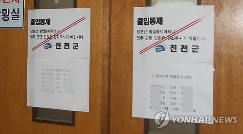 | △ 출입통제한 진천군청 (진천=연합뉴스) 변우열 기자 = 충북 진천군은 10일 중동호흡기증후군(메르스) 의심 증세를 보이는 공무원이 근무한 부서 직원들을 모두 격리조치하고 해당 사무실의 출입을 통제했다. |