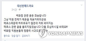 | △ "백화점에 메르스 환자" SNS 거짓 유포 사과글 (인천=연합뉴스) 중동호흡기증후군(메르스)과 관련된 허위 사실을 소셜네트워크서비스(SNS)를 통해 유포한 20대 연인이 경찰에 붙잡혔다. 인천지방경찰청 사이버범죄수사대는 업무방해 및 명예훼손 혐의로 A(20·여)씨와 A씨의 남자친구 B(21)씨를 불구속 입건했다고 12일 밝혔다. 이들은 지난 5일 오후 10시 47분께 C(15)양의 페이스북을 통해 "모 백화점 직원 중에 메르스 환자 2명이 있는데 영업 중단을 하지 않기 위해 숨기고 있다"는 내용의 허위 사실을 유포한 혐의를 받고 있다. 사진은 C양이 허위 사실임을 알고 자신의 페이스북에 올린 사과글 2015.6.12 <<인천지방경찰청>> son@yna.co.kr |