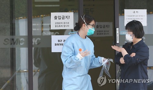| △ 환자와 대화 (서울=연합뉴스) 홍해인 기자 = 12일 서울 일원동 삼성서울병원 응급실에서 한 의료진이 중동호흡기증후군(메르스) 선별진료소로 향하며 환자와 대화하고 있다. 2015.6.12 hihong@yna.co.kr |