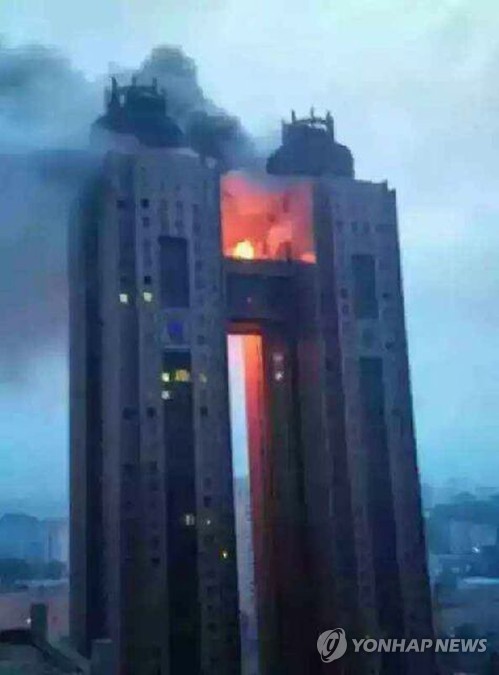 △ 북한을 방문하는 외국인들이 주로 머무는 평양 고려호텔의 화재 장면. 6월 11일 호텔의 두 건물을 연결하는 43층 브리지에서 검은 연기와 불길이 치솟고 있다. 2015.6.12 << BBS 불교방송 제공 >>