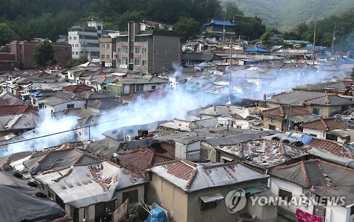| △ 주택가 연무소독으로 메르스 예방 (서울=연합뉴스) 최재구 기자 = 12일 서울 노원구에서 서울시새마을회 관계자들이 중동호흡기증후군(메르스) 확산 방지를 위해 연무소독을 하고 있다. |