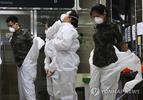 △ 방역복 입는 군 의료 지원단 (대전=연합뉴스) 이재림 기자 = 12일 대전 서구 대청병원에서 군의관과 간호장교가 방역복을 입고 있다. 국방부는 대전시의 요청으로 중동호흡기증후군(메르스) 환자가 발생한 대청병원에서 진료 활동을 펼칠 의료 인력을 파견했다. 2015.6.12 walden@yna.co.kr