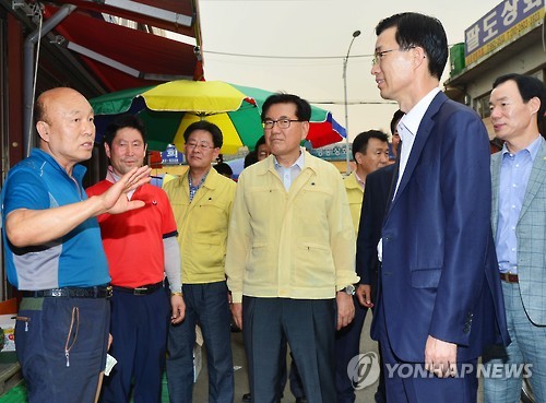 | △ (서울=연합뉴스) 방문규 기획재정부 제2차관(오른쪽 두 번째)이 13일 서울 동대문구 청량리 전통시장을 방문해 상인들의 얘기를 듣고 있다. photo@yna.co.kr |