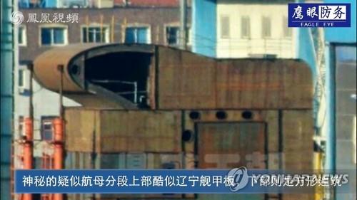 | △ "중국 제2 항공모함 뱃머리, 랴오닝호와 유사" (베이징=연합뉴스) 중국의 첫 항공모함인 랴오닝(遼寧)호와 유사하게 설계된 '중국산 항모'(제2항모)의 뱃머리(선수) 모습이 홍콩 봉황(鳳凰)TV를 통해 14일 공개됐다. 2015.6.14 << 홍콩 봉황TV 캡처 >> |