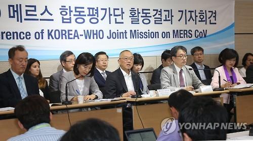 | △ 한국과 세계보건기구(WHO) 합동평가단 공동단장인 후쿠다 게이지 WHO 사무차장(가운데)이 13일 오전 정부세종청사 보건복지부에서 열린 기자회견에서 평가단 활동 결과를 발표하고 있다. 오른쪽은 공동단장인 이종구 서울대 의과대학 이종욱글로벌의학센터 센터장 |