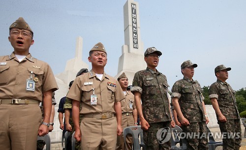 △ 제1연평해전 승전 16주년 기념행사 (평택=연합뉴스) 신영근 기자 = 15일 오전 경기도 평택 해군 제2함대사령부에서 제1연평해전 승전 16주년 기념식이 열려 참석 장병들이 해군가를 부르며 서해 북방한계선(NLL) 수호의지를 다지고 있다. 제1연평해전은 1999년 6월 15일 NLL을 침범한 북한 경비정의 기습사격으로 발발했으며 14분간의 교전 결과 북한군은 함정 1척 침몰, 5척 대파, 4척 중파 등 큰 피해를 보았지만 우리 해군은 함정 2척이 경미한 손상을 입는 데 그치며 압도적 승리를 거둔 해전이다. 2016.6.15 drops@yna.co.kr http://blog.yonhapnews.co.kr/geenang
