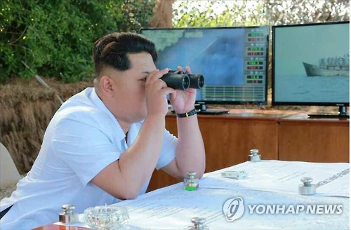 △ '미사일 잘 날아가나' 발사 훈련 참관하는 김정은 (서울=연합뉴스) 북한이 해군 부대들에 실전 배치 중인 신형 반(反)함선(대함) 미사일 발사 훈련을 실시했다고 노동신문이 15일 보도했다. 김정은 국방위원회 제1위원장이 발사 훈련을 참관하고 있다. 2015.6.15 nkphoto@yna.co.kr
