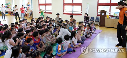 △ 소방서 관계자들이 서울의 한 유치원에서 원생 및 교사를 대상으로 메르스 감염방지를 위한 올바른 기침범 교육을 하고 있다.(연합뉴스 자료사진)