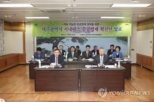 △ 재정 위협하는 '시내버스 준공영제' 손질 (대구=연합뉴스) 14일 대구시청 2층 상황실에서 시내버스 준공영제 개혁시민위원회가 지난 4개월 동안 마련한 '버스 준공영제 혁신안'을 발표하고 있다. 2015.5.14 <<대구시 제공>> suho@yna.co.kr