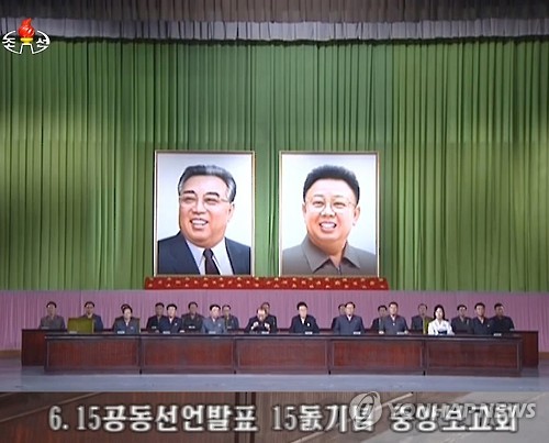 △ 북한, 6·15공동선언 15주년 기념 중앙보고회 (서울=연합뉴스) 북한은 15일 조선중앙TV를 통해 방영한 '6·15공동선언 발표 15주년 기념 중앙보고회'에서 이날 발표한 '공화국 정부 성명'에 대해 남한 정부가 관계회복을 원하면 이에 호응해야 한다고 촉구했다. 북한은 이날 6·15 남북공동선언 발표 15주년을 맞아 김정은 체제 들어 두 번째로 정부 성명을 발표하고 남한 정부와 대화·협상을 할 용의를 내비쳤다. 2015.6.15. nkphoto@yna.co.kr