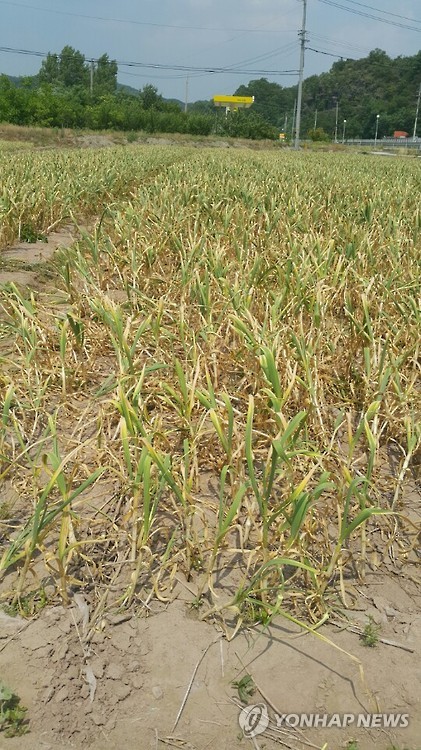△ 바싹 마른 마늘밭 (의성=연합뉴스) 이강일 기자 = 계속된 가뭄으로 경북 의성군 단촌면 세촌리의 한 마늘밭이 물기라고는 찾아볼 수 없을 정도로 바짝 말랐다. 2015.6.16 leeki@yna.co.kr