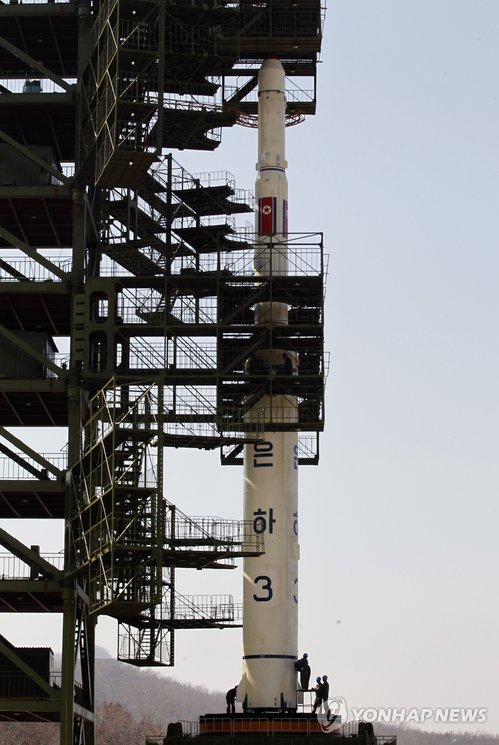 | △ 국방부는 지난 1월 6일 발간한 '2014 국방백서'에서 북한의 핵·미사일 위협과 관련 핵무기 소형화 능력은 상당한 수준이고 장거리 미사일 발사를 통해 미국 본토를 위협할 수 있는 능력을 보유한 것으로 추정했다. 지난 2012년 4월8일 평안북도 철산군 동창리 미사일 발사장에서 발사를 기다리고 있는 은하 3호. 2015.1.6 photo@yna.co.kr |