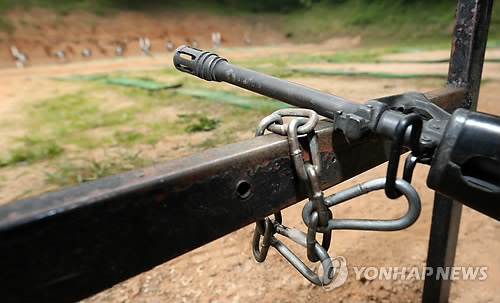 | △ 총기 이탈방지대에 묶인 총기 (대전=연합뉴스) 배재만 기자 = 15일 육군 32사단 예하 대전 유성구 예비군훈련장에서 총기 이탈방지대에 총기가 사슬로 묶여 있다. 이날 훈련은 규정대로 실탄을 3발씩 탄창 2개에 나눠 지급하고, 총기 이탈방지대와 안전고리를 단단히 묶어 총구를 돌리지 못하도록 하며 사격장 사로(사격 구역) 마다 조교를 1명씩 배치하는 등 엄격한 안전통제 하에 이뤄졌다. 2015.5.15 scoop@yna.co.kr |