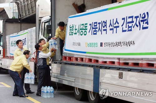 (세종=연합뉴스) 김아람 기자 = 농협중앙회와 전국금융산업노동조합 NH농협지부는 가뭄으로 어려움을 겪는 강원·충북 지역에 16일 생수 3천500만원어치(7만6천800ℓ)를 지원했다.