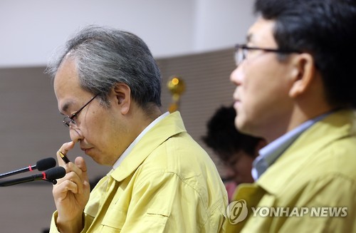 △ '고심' (세종=연합뉴스) 배재만 기자 = 권준욱 중앙메르스관리대책본부 기획총괄반장(왼쪽)이 16일 오전 정부세종청사 보건복지부 공용브리핑룸에서 열린 중동호흡기증후군(메르스) 정례 브리핑에서 메르스 환자 현황에 대한 기자들의 질문에 답하던 중 잠시 생각에 잠겨 있다. 오른쪽은 권덕철 총괄반장. 2015.6.16 scoop@yna.co.kr http://blog.yonhapnews.co.kr/f6464