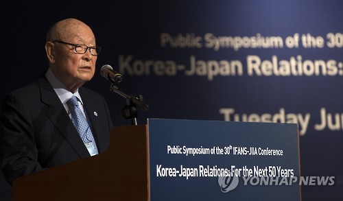 △ 기조연설하는 공로명 동아시아재단 이사장 (서울=연합뉴스) 윤동진 기자 = 16일 오후 서울 서초구 국립외교원에서 국립외교원과 일본국제문제연구소 공동으로 개최한 한일관계학술회의에서 공로명 동아시아재단 이사장이 기조연설을 하고 있다. 2015.6.16 mon@yna.co.kr