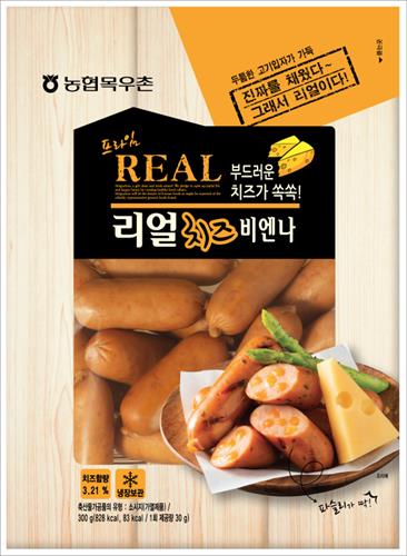 리얼 치즈비엔나는 돼지고기를 시중 제품보다 두툼하게 8㎜ 정도로 잘라 채우고 가공치즈와 파슬리를 넣은 비엔나소시지다.