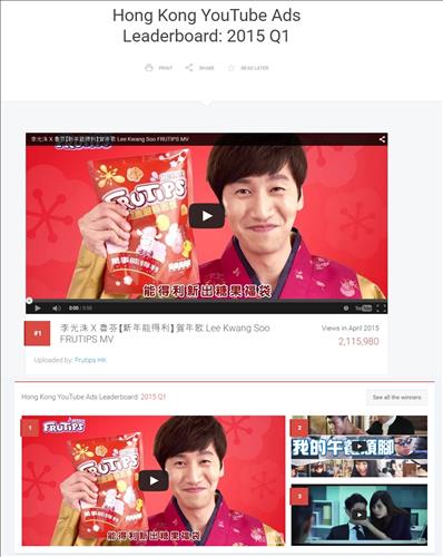 구글이 주최하는 '유튜브 광고 리더보드'(YouTube Ads Leaderboard) 홍콩 지역 시상식에서 이광수의 프루팁스 광고 영상이 홍콩 유튜브 2015 첫 시즌(1~4월)에서 조회수 213만 건을 넘어서며 랭킹 1위를 기록했다.