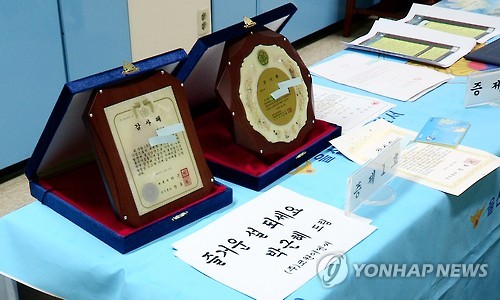 △ 위조된 대통령 명의 감사패 (울산=연합뉴스) 김근주 기자 = 울산 울주경찰서는 대통령 측근 행세를 하며 돈을 뜯어낸 혐의(사기)로 이모(53)씨를 구속했다고 17일 밝혔다. 이씨가 사람들을 속이기 위해 위조한 대통령 명의의 감사패. 2015.6.17 canto@yna.co.kr