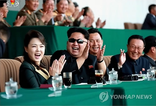 △ 북한 김정은·리설주 부부, 축구관람 중 '박장대소'(연합뉴스 자료사진)
