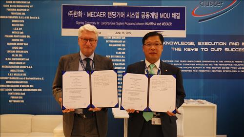 한화는 지난 16일(현지시간) 프랑스 파리 에어쇼 현장에서 글로벌 항공기 랜딩기어 전문업체인 미카에르(Mecaer Aviation Group1)사와 랜딩기어 시스템 분야 국제공동개발에 관한 양해각서(MOU)를 체결했다.