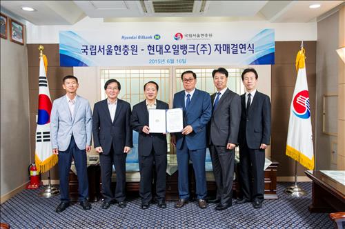 | △ 현대오일뱅크와 국립서울현충원의 자매결연식 모습. 왼쪽부터 국립서울현충원 박종덕 현충과장, 안춘순 관리과장, 이선근 현충원장, 현대오일뱅크 김병섭 부사장, 이정현 상무, 하원준 부장 |