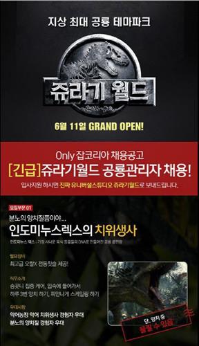 취업준비생들이 자주 찾는 '잡코리아' 홈페이지에는 최근 '쥬라기 월드'의 공룡 관리자를 모집한다는 독특한 공고가 올라왔다.