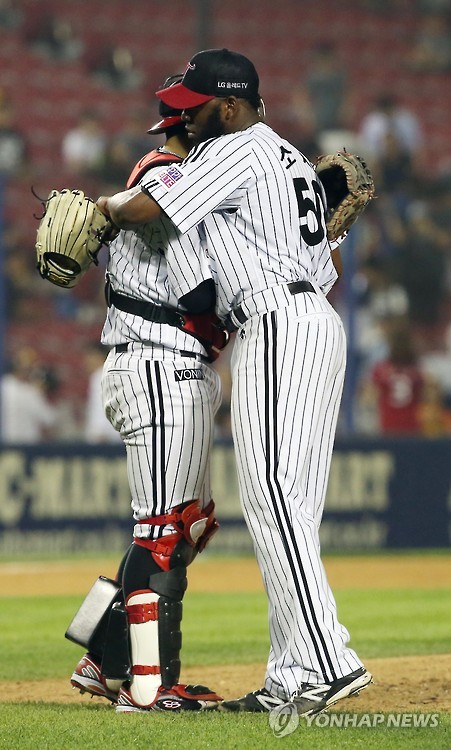 △ '수고했어 오늘도' (서울=연합뉴스) 박동주 기자 = 17일 서울 잠실야구장에서 열린 프로야구 LG와 KIA의 경기. 완봉승을 거둔 LG 선발 소사가 포수 유강남과 기쁨을 나누고 있다. 2015.6.17 pdj6635@yna.co.kr