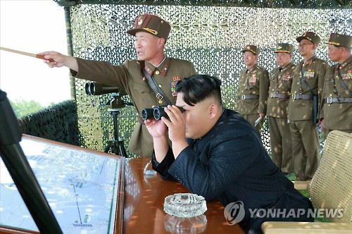 △ 북한 김정은, 고사포병 사격경기 참관 (서울=연합뉴스) 김정은 북한 국방위원회 제1위원장이 인민군 항공 및 반항공군, 호위사령부인 제963대연합부대와 3군단으로 알려진 제526대연합부대 산하 고사포병 중대, 고사포병 군관학교 교원과 학생으로 편성된 중대들이 참가한 고사포병 사격경기를 참관했다고 노동신문이 18일 보도했다. 김정은 제1위원장이 쌍안경으로 경기를 지켜보고 있다. 2015.6.18 nkphoto@yna.co.kr