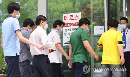 | △ "삼성서울병원 전 직원 매일 발열감시" (서울=연합뉴스) 임헌정 기자 = 17일 중동호흡기증후군(메르스) 확산 여파로 부분적인 병원 폐쇄조치가 내려진 서울 일원동 삼성서울병원에서 보안요원이 일반인의 출입을 통제하는 가운데 직원들이 마스크를 쓰고 병원으로 들어가고 있다. kane@yna.co.kr |