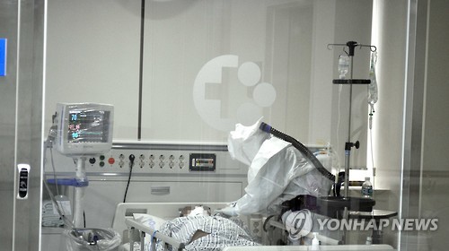 | △ (부산=연합뉴스) 동아대병원 격리병실에서 의료진이 143번 환자(31)를 치료하고 있다. 2015.6.14 << 동아대병원 제공 >> ccho@yna.co.kr |