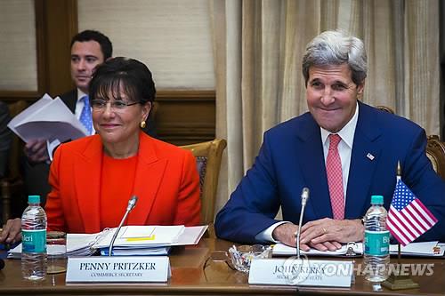 | △ 페니 프리츠커 미 상무장관(왼쪽)과 존 케리 국무장관(AP=연합뉴스 자료사진) |