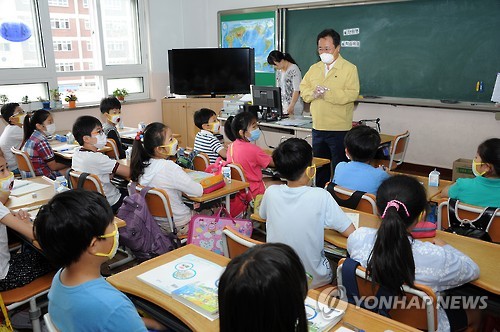 △ (부산=연합뉴스) 김석준 부산시교육감이 18일 3일간의 휴업을 끝내고 문을 연 한 초등학교를 방문, 학생들에게 메르스 감염예방 요령을 설명하고 있다. 2015.6.18 << 부산시교육청 >> youngkyu@yna.co.kr