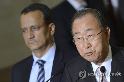 △ (AP= 연합뉴스 사진자료) 제네바에서 예멘 평화회담 시작한 반기문 유엔 사무총장과 이스마일 울드 셰이크 아흐메드 유엔 예멘 특사의 모습.