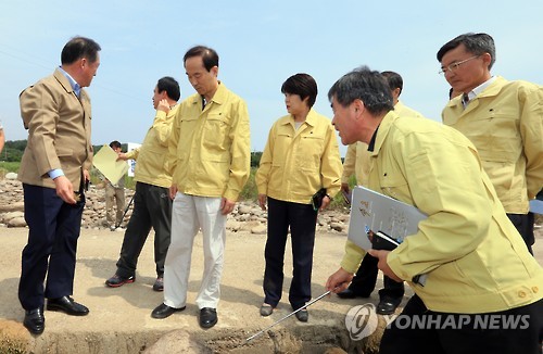 | △ 가뭄 현장 찾은 윤성규 환경장관 (속초=연합뉴스) 이종건 기자 = 가뭄으로 제한급수 중인 속초시를 방문한 윤성규 환경부장관이 20일 속초시의 취수원인 쌍천을 찾아 이병선 속초시장, 김미영 강원도경제부지사 등과 함께 주변을 둘러보고 있다. 속초시는 지난 17일부터 매일 오후 10시∼다음날 오전 6시 시 전역에 급수를 중단하고 있다. 2015.6.20 momo@yna.co.kr |