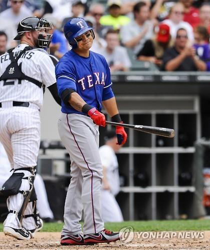 △ 추신수(33.텍사스 레인저스)가 20일(현지시간) 시카고 화이트삭스와의 경기에서 5회 2사 2루 찬스 때 삼진으로 물러난 뒤 주심의 스트라이크 판정에 아쉬움을 나타내고 있다. (AP=연합뉴스)