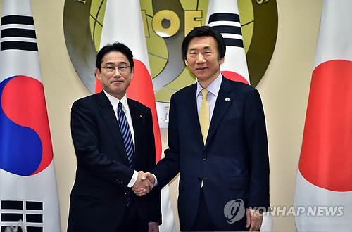 | △ 윤병세 외교부 장관(오른쪽)과 기시다 후미오(岸田文雄) 일본 외무상(AP=연합뉴스 자료사진) |