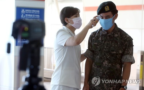 | △ 휴가 복귀하는 병사 (계룡=연합뉴스) 양영석 기자 = 국방부가 메르스 확산 방지차원에서 시행했던 병사들의 휴가제한을 해제한 가운데 15일 계룡대 근무지원단 관계자들이 휴가를 끝내고 계룡대로 복기하는 한 병사의 체온을 측정하고 있다. 2015.6.15 youngs@yna.co.kr |