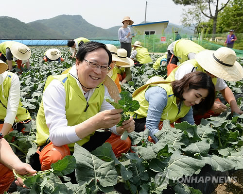 | △ NH농협금융지주 김용환 회장이 지난달 14일 임직원들과 함께 강원 홍천 왕대추마을에서 영농철 일손돕기를 하고 있다. |