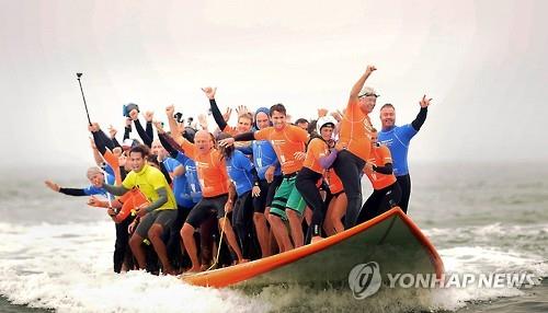 (헌팅턴비치<샌프란시스코> AP=연합뉴스) 미국 샌프란시스코에서 서핑 보드에 66명이 한꺼번에 올라타 '서핑 보드 한 개에 사람 많이 타기' 세계 신기록을 경신했다.